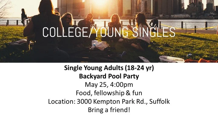 Single Young Adults Backyard Pool Party Saturday, May 25, 2019 4:00 PM 6:00 PM 3000 Kempton Park Rd. Suffolk United States (map) Google Calendar ICS Register Here